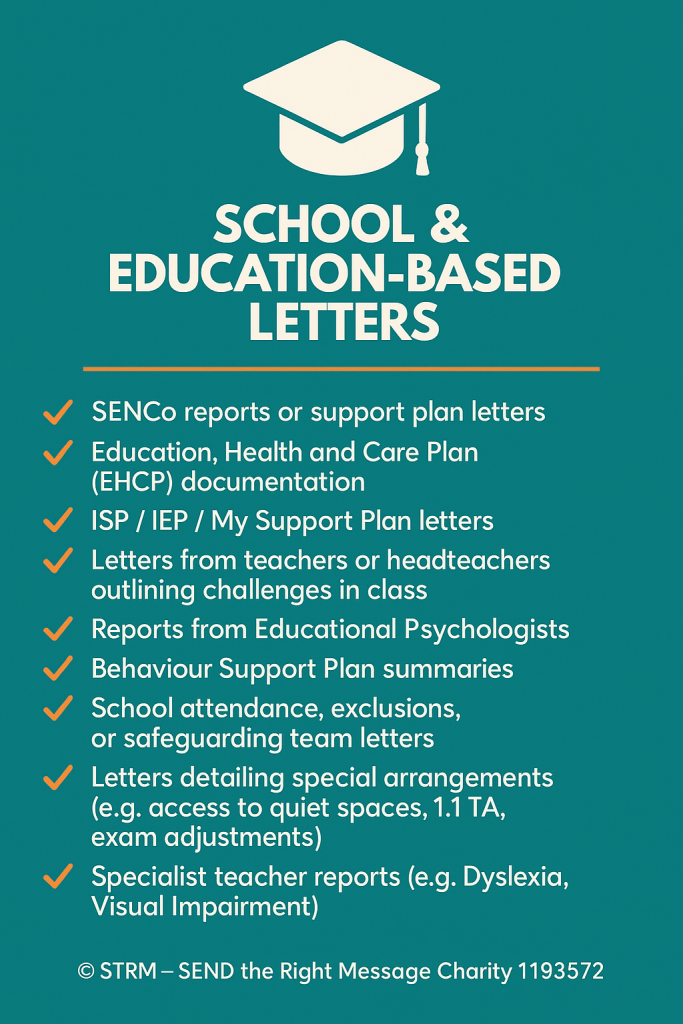 Schools often hold valuable insight into your child’s day-to-day challenges, strengths, and the support they need. The letters and reports shared by schools and education professionals can be powerful evidence when you’re applying for extra help or explaining your child’s needs to other services.
