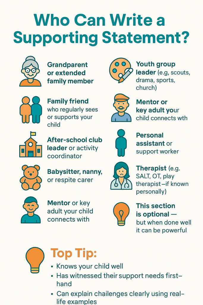 Sometimes, a statement from someone else who knows your child well can add weight to your claim. This could be a therapist, support worker, carer, family member, or trusted professional who understands your child’s needs and daily challenges.