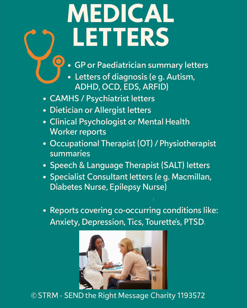 When you’re applying for extra support (like Disability Living Allowance, EHCPs, or help at school), you’ll often be asked for “medical evidence.” But don’t worry – this doesn’t just mean hospital letters or long reports. It includes any written information from health professionals that explains your child’s condition, diagnosis, or day-to-day needs.