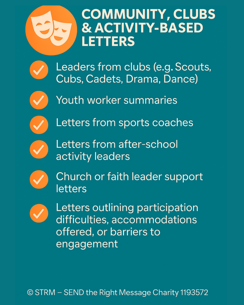 If your child takes part (or struggles to take part) in activities like Scouts, sports, drama, or youth groups, the adults who run those sessions might be able to write a support letter that shows what’s working — or what’s hard.